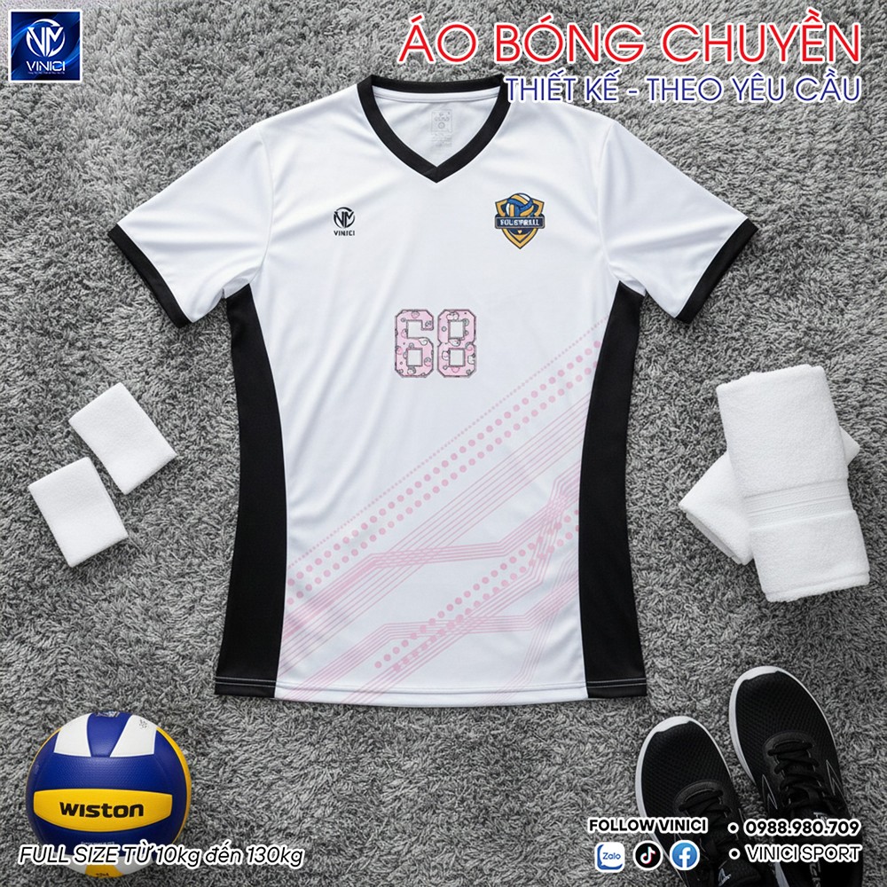 Áo bóng chuyền BC02-VNC068-17 màu trắng phối họa tiết hồng và viền đen nổi bật, chất liệu co giãn thoáng khí, thiết kế unisex năng động, dễ tùy chỉnh tên – số áo.