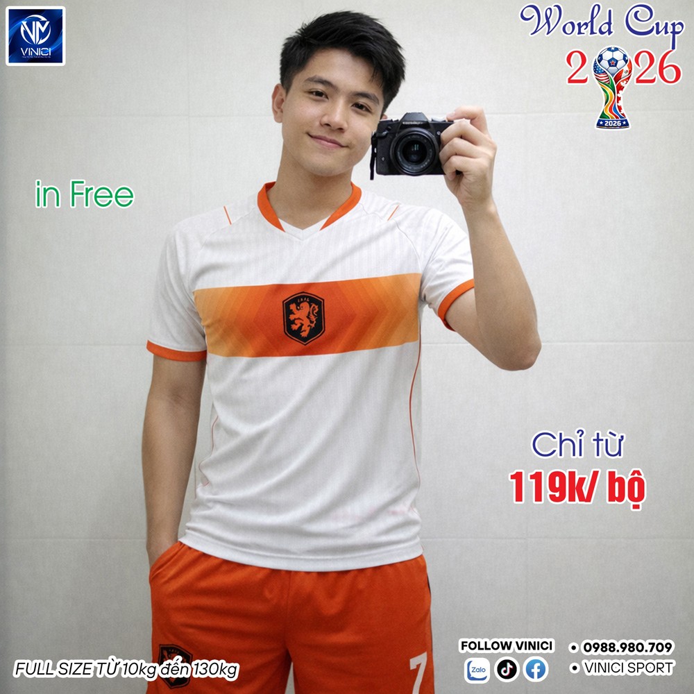 Khám phá mẫu áo bóng đá đội tuyển Hà Lan sân khách World Cup 2026 với gam màu trắng sáng điểm nhấn cam nổi bật, thiết kế tinh tế, thoáng mát và phù hợp mọi vóc dáng từ 10kg tới 130kg.