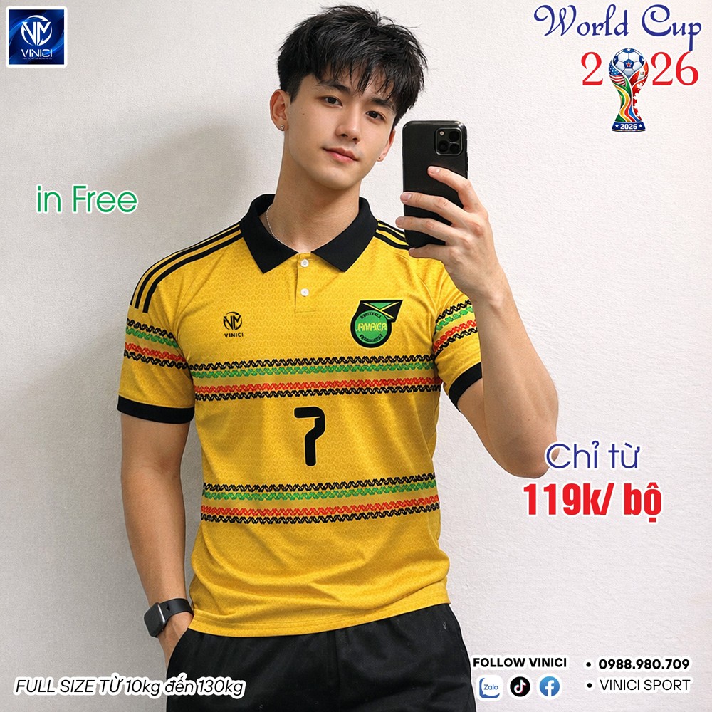 Áo bóng đá Tuyển Jamaica World Cup 2026 nổi bật với sắc vàng chủ đạo, họa tiết sọc nhiều màu hiện đại, chất liệu polyester pha thoáng mát. Áo đa dạng kích cỡ từ 10kg đến 130kg, thích hợp cho mọi lứa tuổi. Giá chỉ từ 119k, lựa chọn hoàn hảo cho mọi tín đồ bóng đá!
